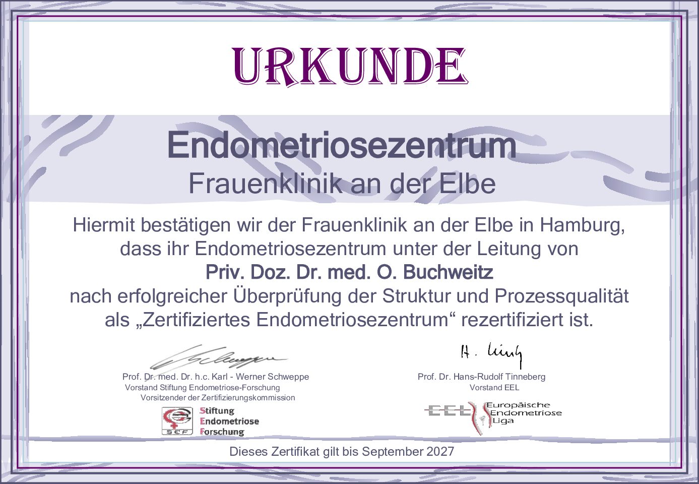 Die Operateure der Klinik erfüllen den höchsten Kompetenzgrad ihrer Fachgesellschaft (Arbeitsgemeinschaft Endoskopie MIC III oder Arbeitsgemeinschaft für Urogynäkologie und plastische Beckenbodenchirurgie AGUB II). Erwähnenswert ist auch, dass wir in der FOCUS-Top-Mediziner-Liste vertreten sind.